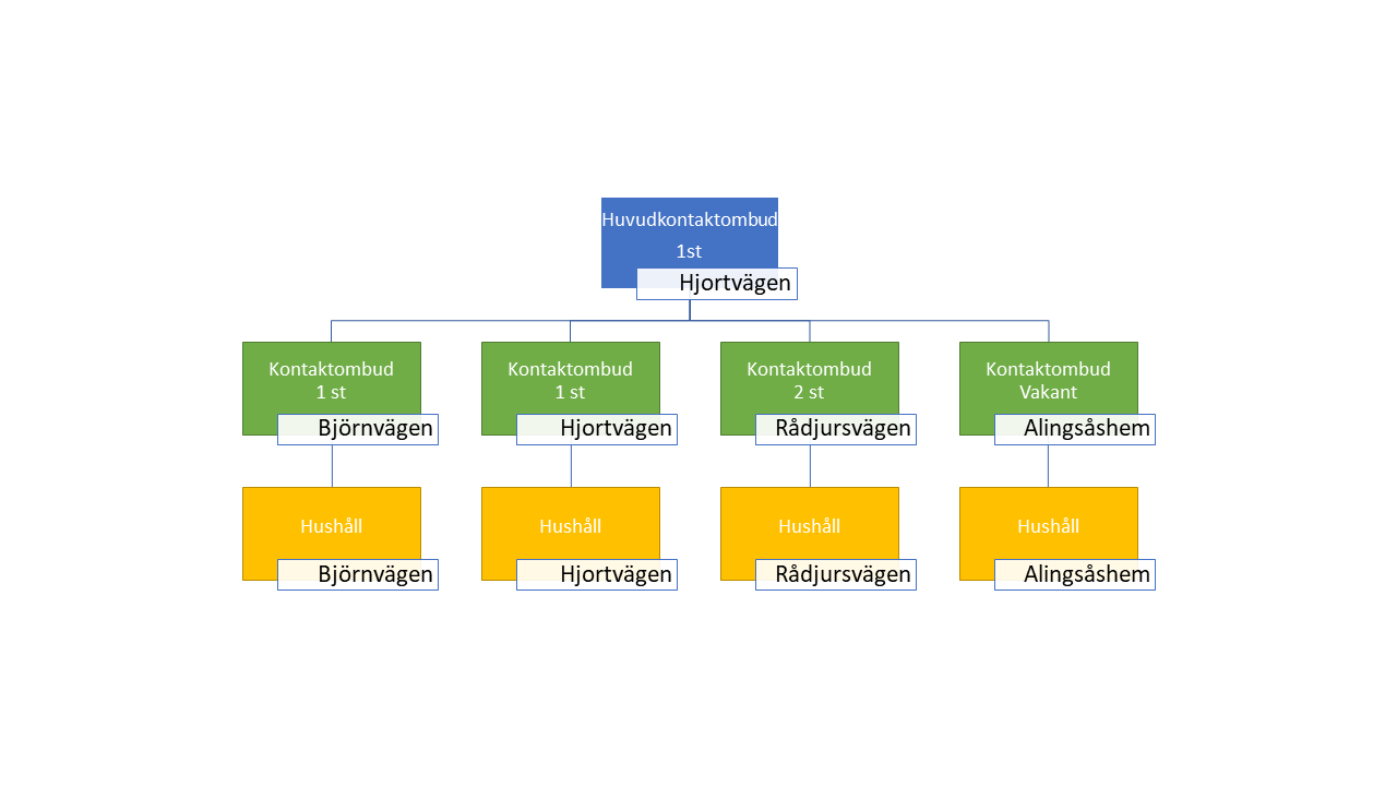 - Utse kontaktpersoner för delområden björnvägen, rådjursvägen, hjortvägen samt alingsåshems hushåll på hjortvägen.